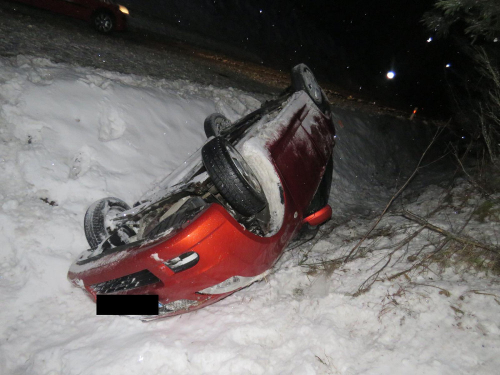 Na sněhu dostal smyk, vyjel ze silnice a skončil v příkopu na střeše
