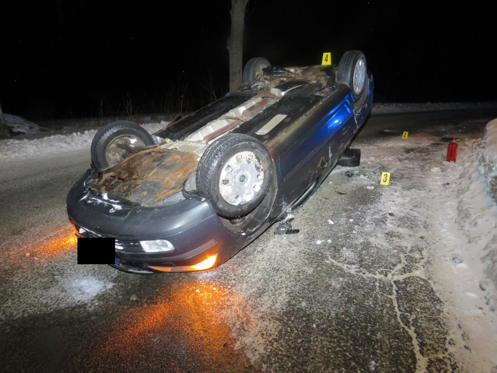 FOTO: Smyk na zasněžené vozovce skončil převráceným vozem