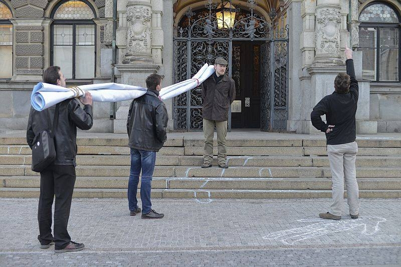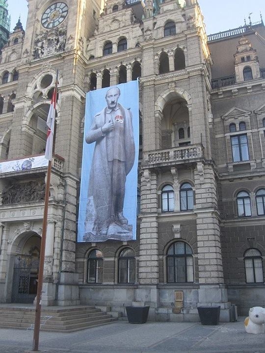 Obří plachta visí na radnici od úterního rána. Foto: Roman Dobeš