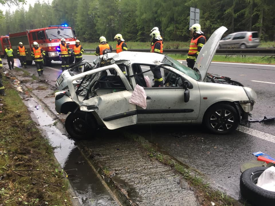 FOTO: Nehoda u Rynoltic. Auto se na mokru otočilo přes střechu