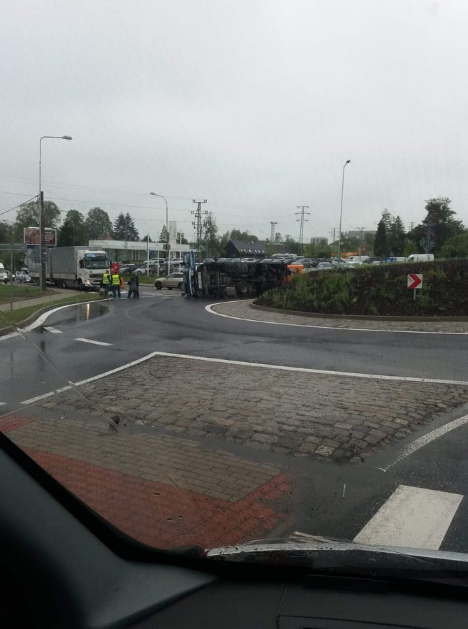 Na kruháči u průmyslové zóny byl náklaďák na boku, místem už projedete