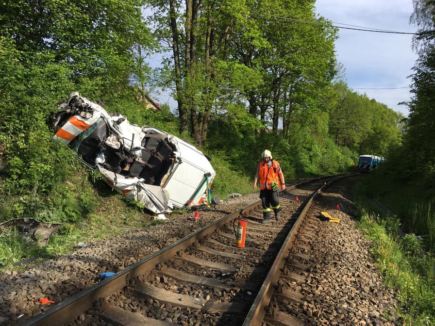 FOTO: Vážná nehoda ve Stráži. Vlak na přejezdu smetl dodávku, řidič je těžce zraněný