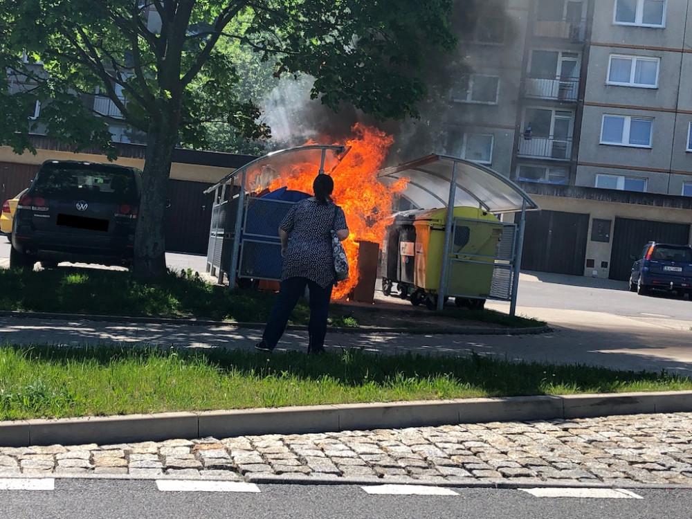 Na Dobiášovce shořelo stání s kontejnery. Žár poškodil i vedle zaparkované auto