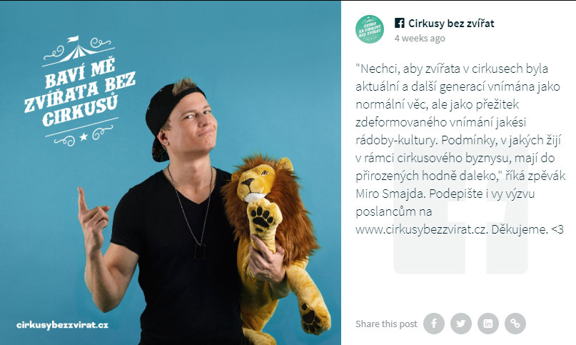 Divoká zvířata do šapitó nepatří, kampaň chce Cirkusy bez zvířat! Podporují ji i známé osobnosti