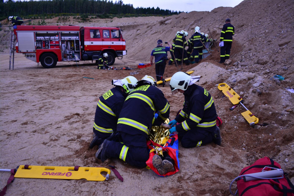 Část pískovny se zřítila a zavalila několik osob, takovou situaci nacvičovali hasiči v okolí Horní Řasnice