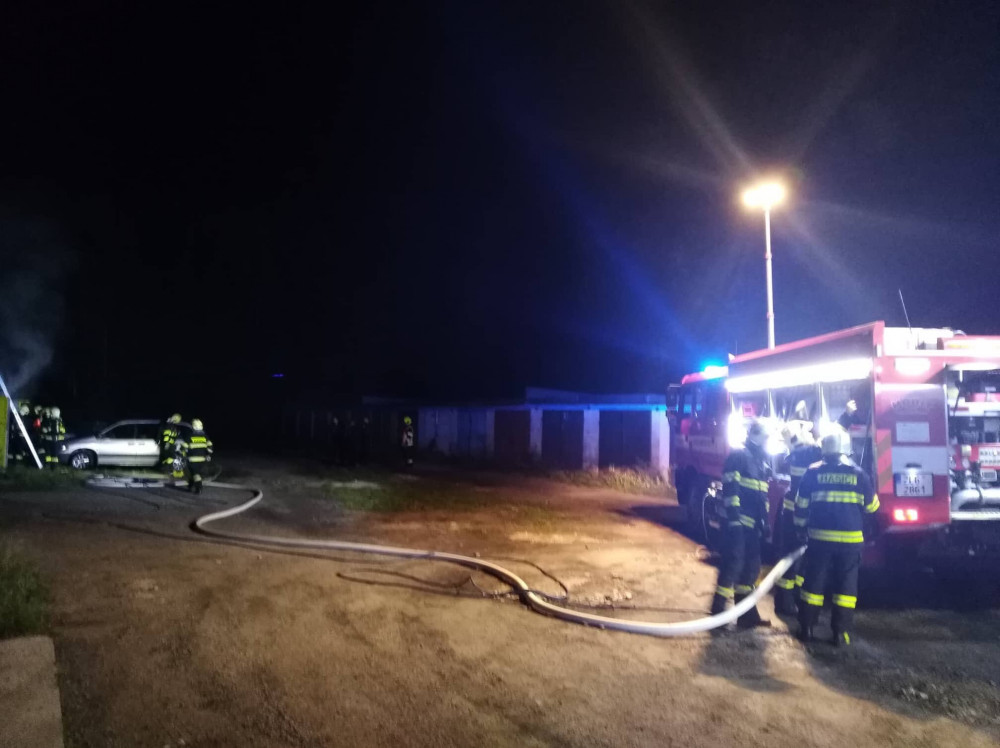FOTO: Z garáže na Jeřábu v noci šlehaly plameny. Zasahovaly tři jednotky hasičů
