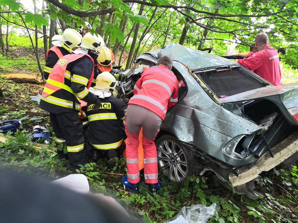 FOTO: Vážná nehoda u Dalešic. Řidič s autem vylétl ze silnice, je těžce zraněný