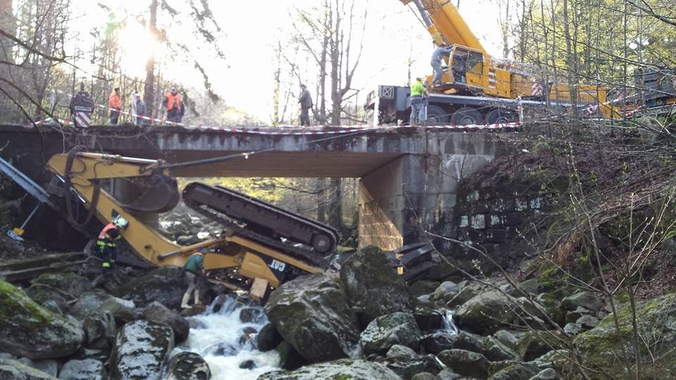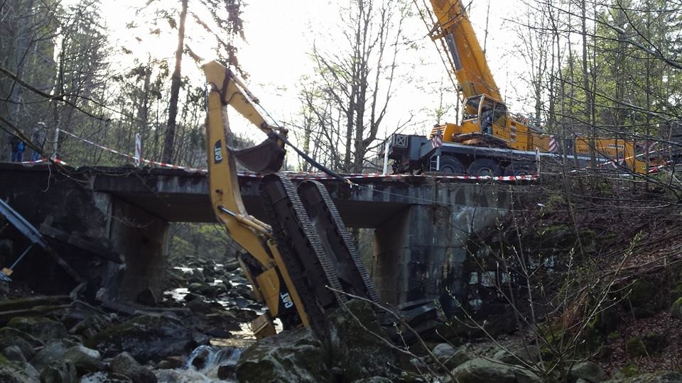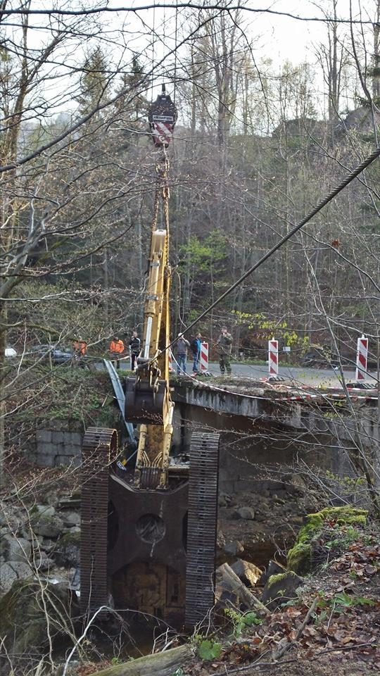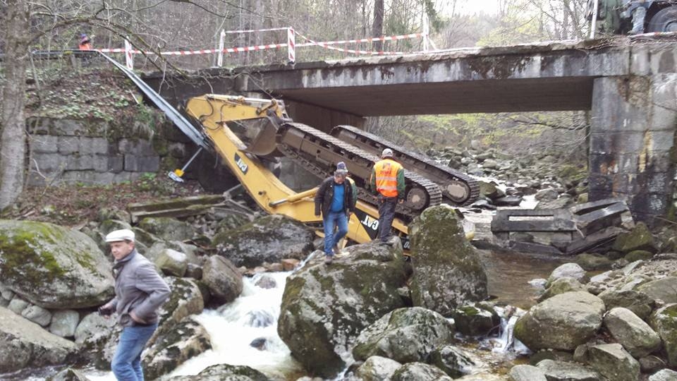 Prázdný bagr prorazil svodidla a zřítil se z mostu do řeky