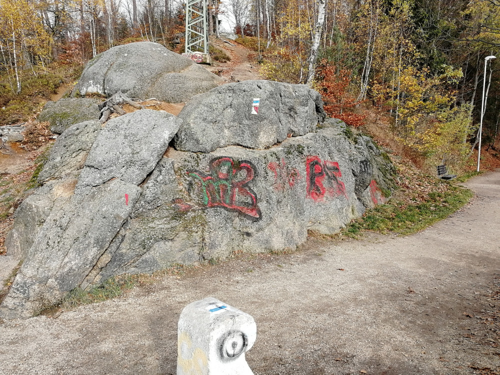 Takto neznámý vandal poničil skály u jablonecké přehrady.