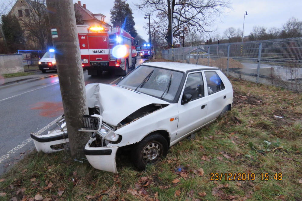 Kapr skočil za jízdy ženě do klína, skončila i s autem v betonovém sloupu