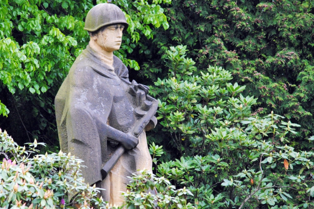 Vojín stojí v rohu vojenského hřbitova