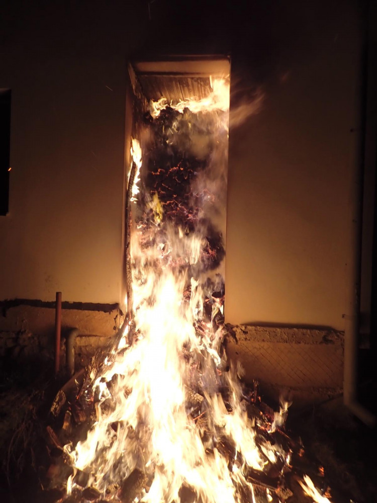 Hořící přístřešek plný dřeva