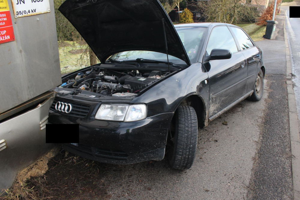 Řidičku překvapila namrzlá vozovka. Dostala smyk a skončila v elektrickém rozvaděči
