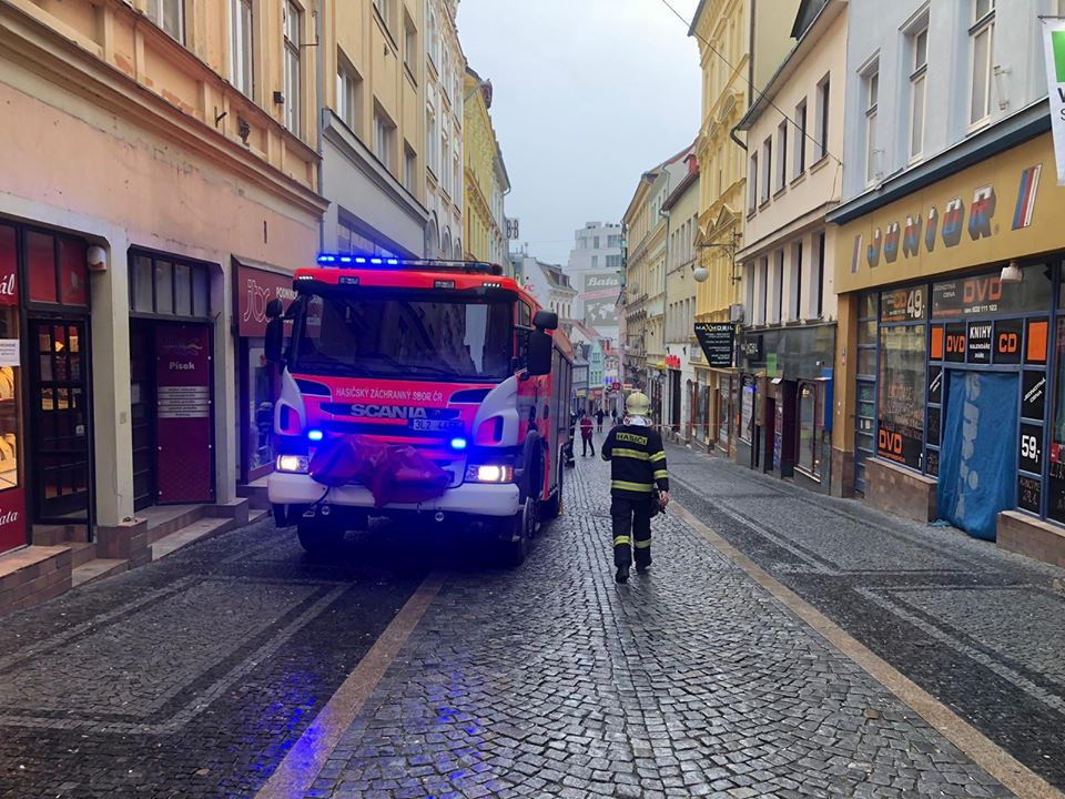 Hasiči uzavřeli Pražskou. Na střeše jednoho z domů se ulomil komín