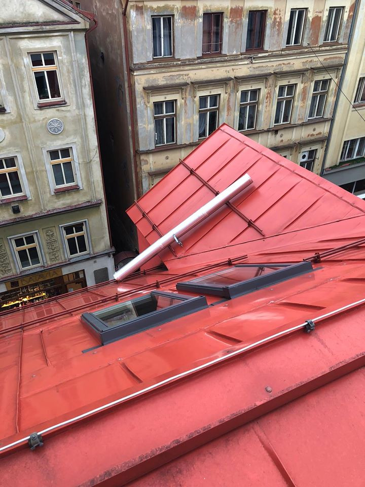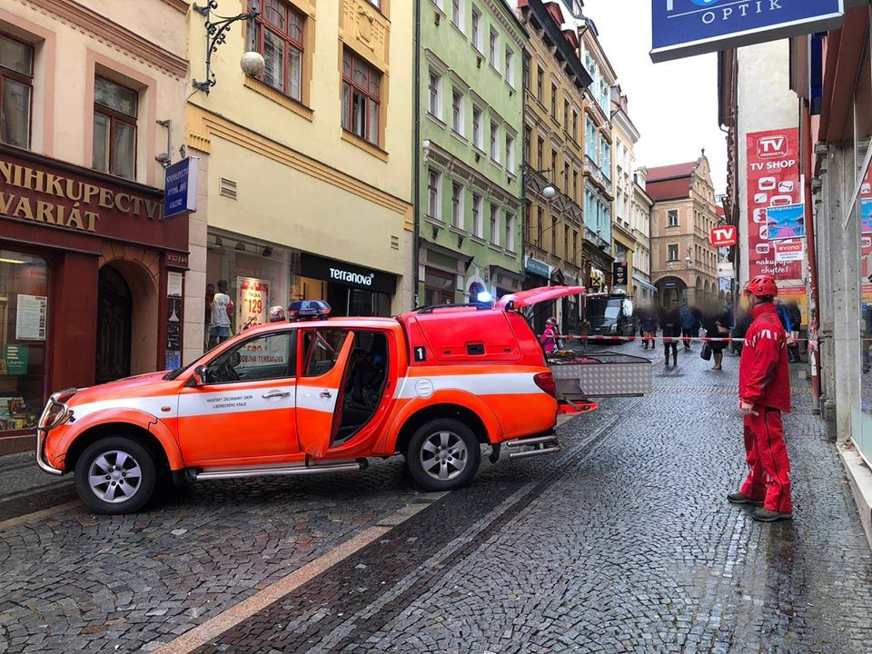 FOTO: Hasiči uzavřeli Pražskou. Na střeše jednoho z domů se ulomil komín