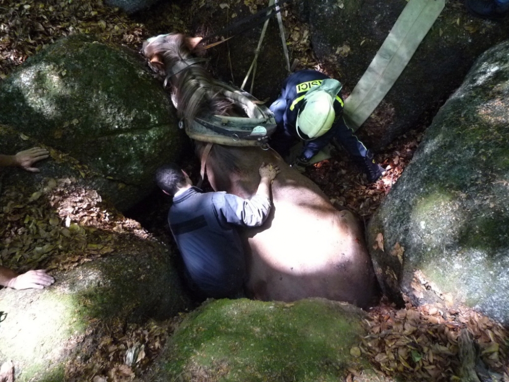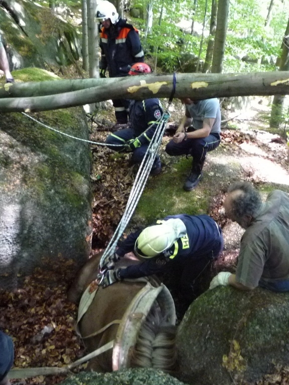 Hasiči se zapotili, tři hodiny tahali kobylu ze sevření balvanů
