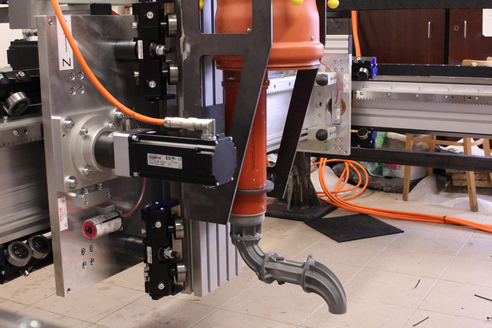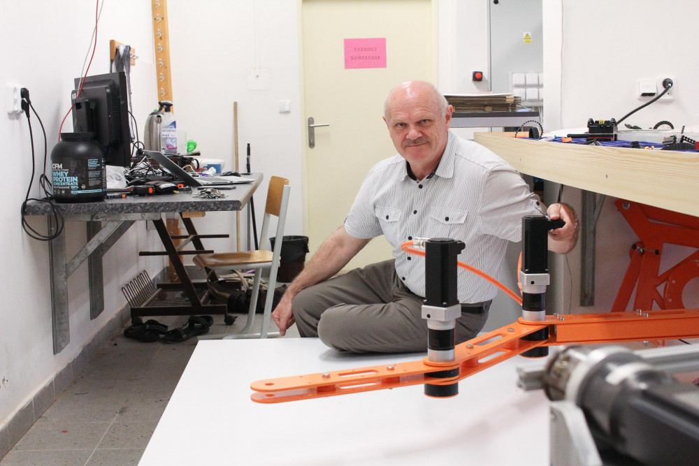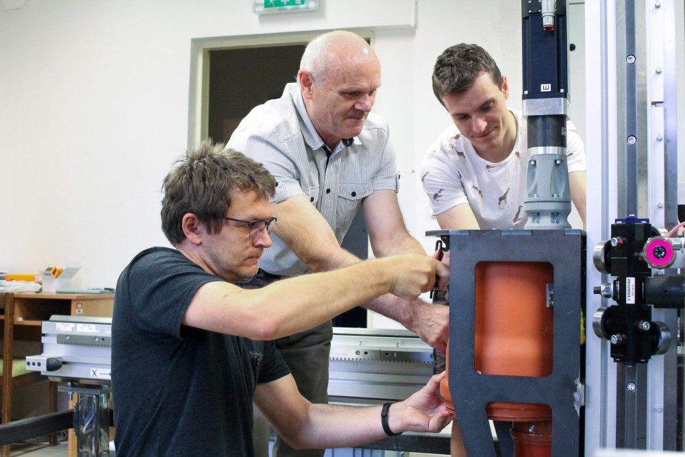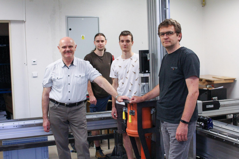 Testovací zařízení pro stavební 3D tisk brzy zamíří do Kloknerova ústavu. Část týmu z FM jej proto nyní demontuje. V popředí vlevo Václav Záda, vpravo Leoš Beran