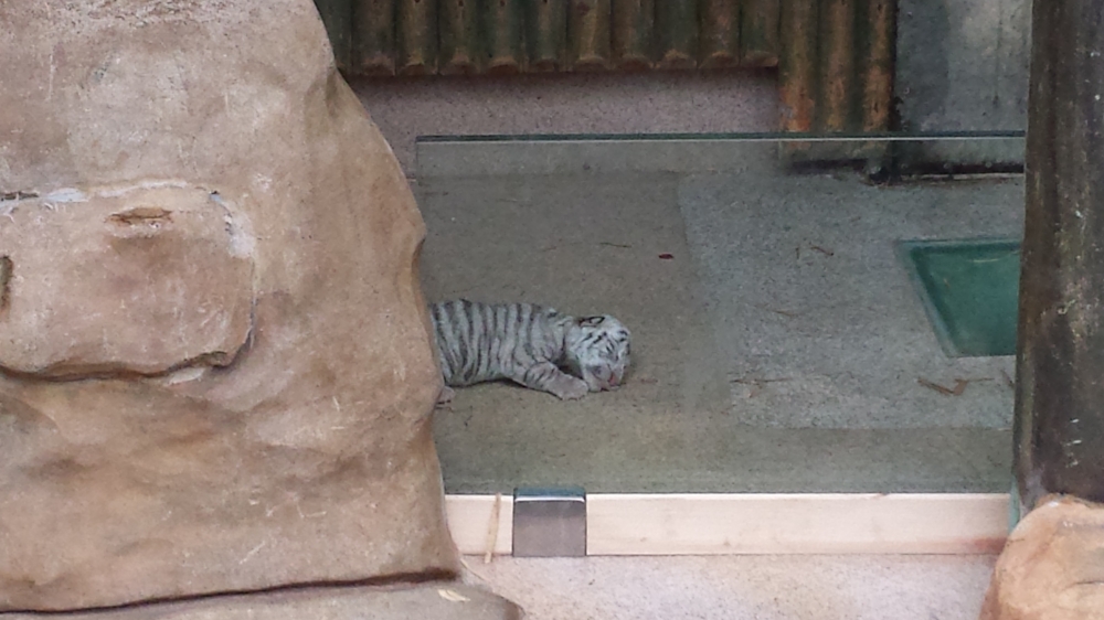 V ZOO se narodil malý bílý tygřík. Hned se vydal na procházku