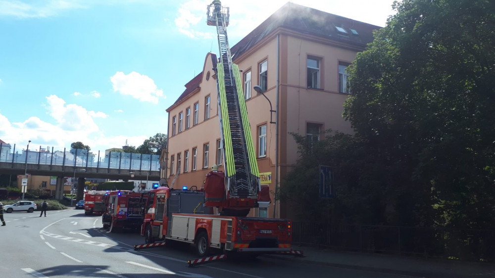 Požár domu na Poštovním náměstí v Liberci. Hasiči zachraňovali obyvatele výškovou technikou