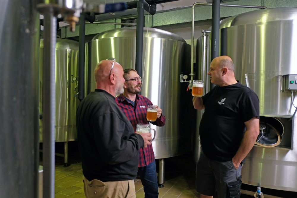 Zleva sládek Vladimír Ličman (Pivovar Zvíkov), sládek Aleš Dvořák (Budějovický Budvar) a spolumajitel zvíkovského pivovaru Michal Voldřich.