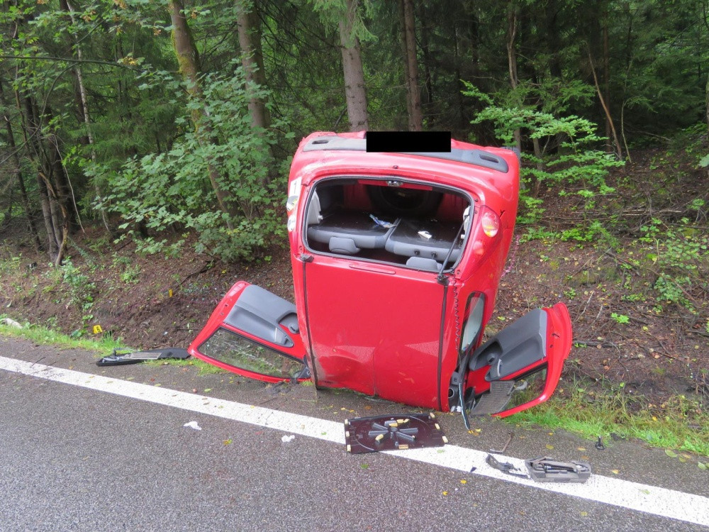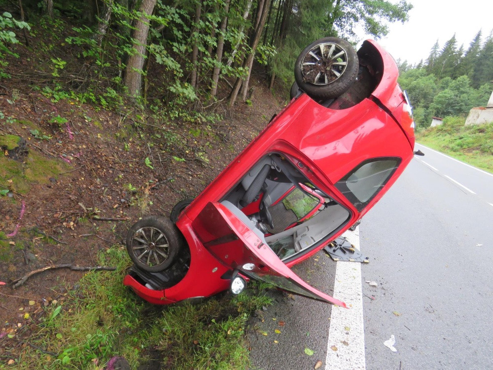 Řidička nezvládla jízdu na mokrém povrchu, dostala smyk a skončila na střeše