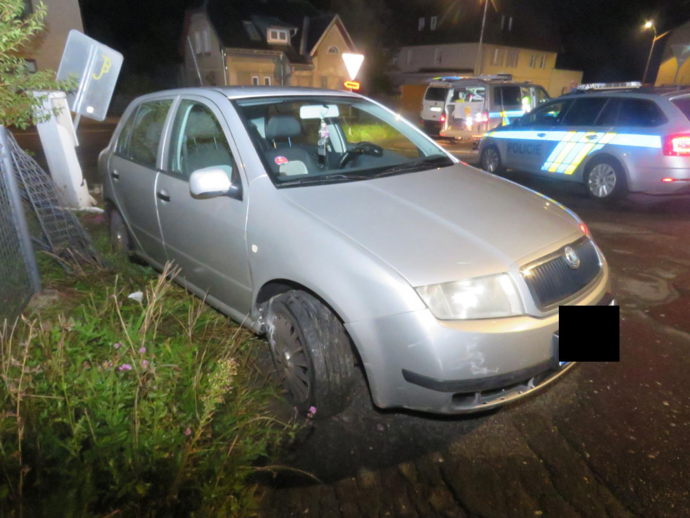Řidič v opilosti nabral dopravní značku a skončil v plotě domu