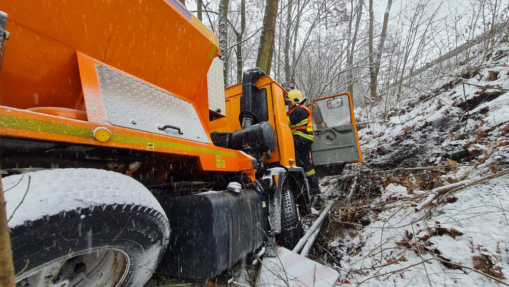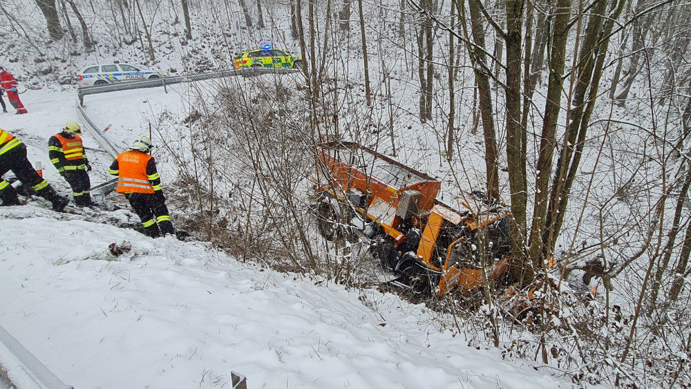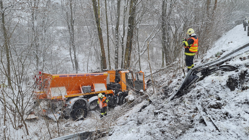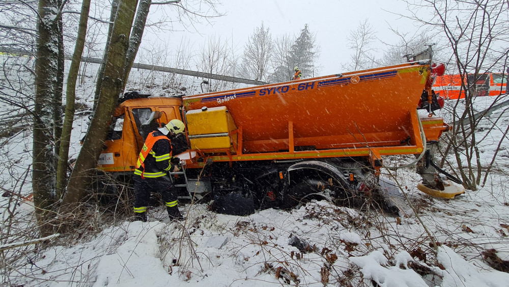 FOTO: V Dolánkách havaroval sypač. Ve svahu se zastavil až o strom