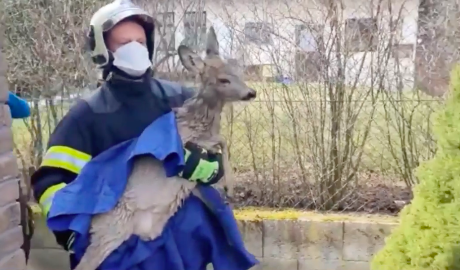 Srnka se topila v bazénu v Hanychově. Zachránili ji hasiči