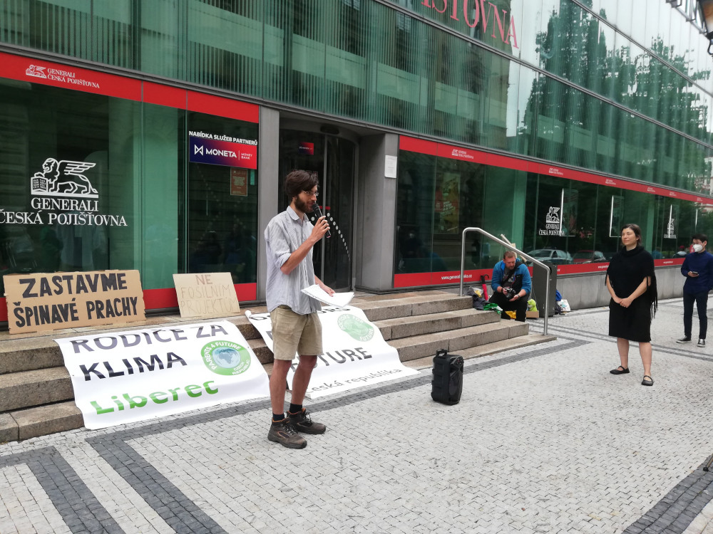 Koalice Zastavme špinavé prachy bojuje proti fosilním palivům. V Liberci protestovala před pojišťovnou