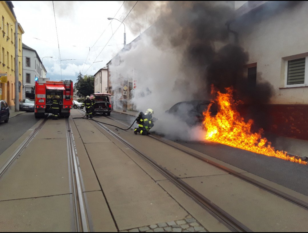 Výbuchy a oheň v Hanychovské ulici. Shořelo tam osobní auto