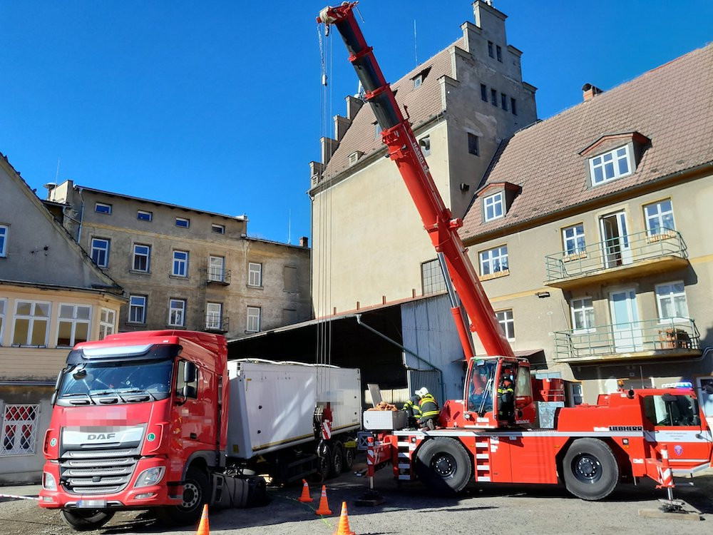 Část kamionu v Raspenavě se propadla do propustku. Ven mu pomohl jeřáb