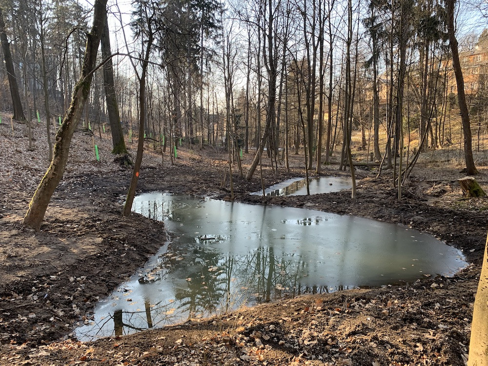 Proměna lesoparku ve Fibichově ulici. Les je prokácený, vznikly zde nové tůně