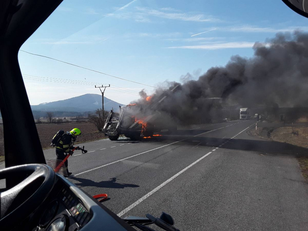 Traktor začal hořet na silnici v Holanech. V přívěsu vezl dobytek