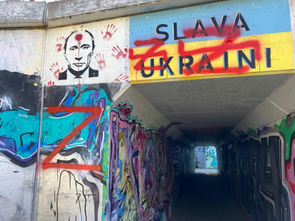 Symbol ruské agrese na zdech turnovského podchodu. Vandal posprejoval ukrajinskou vlajku i portrét Václava Havla