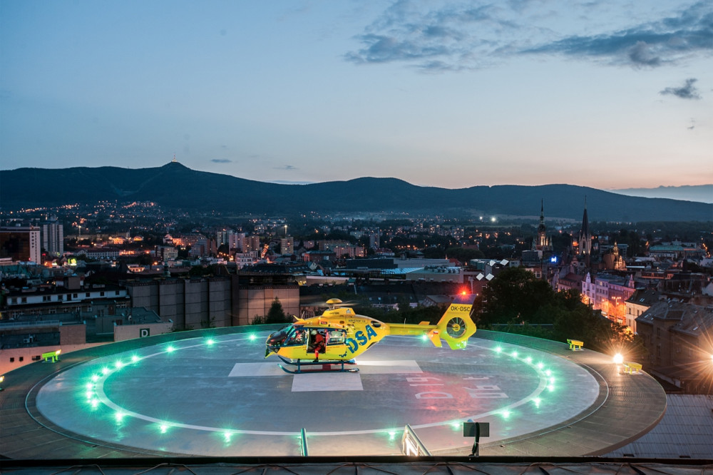Osvětlený heliport v areálu liberecké nemocnice.