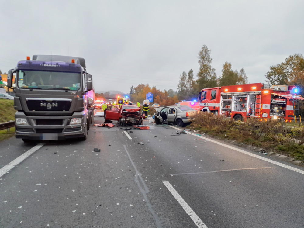Vážná nehoda na příjezdu do Liberce. Dva lidé jsou po srážce dvou aut s náklaďákem v kritickém stavu