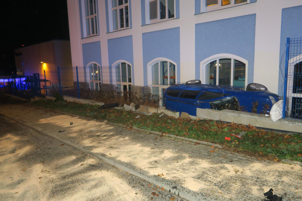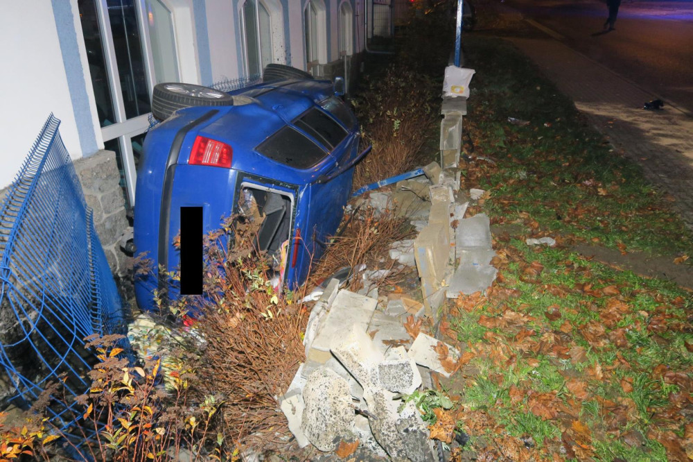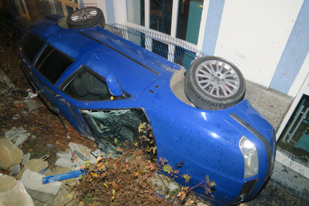 Mladý řidič nezvládl jízdu a havaroval. Prorazil plot a auto skončilo na boku opřené o dům