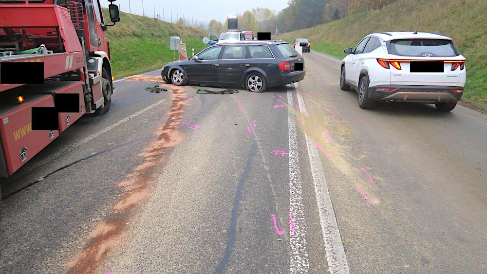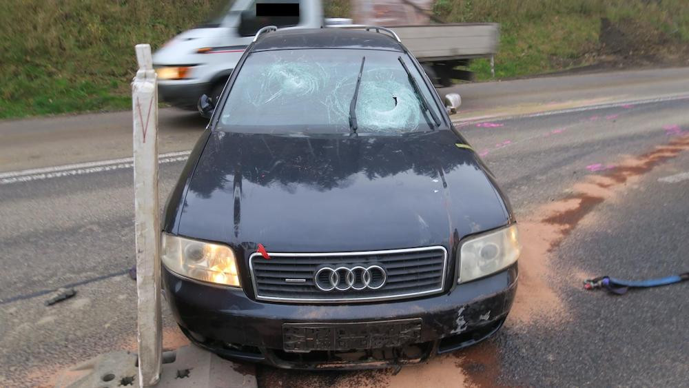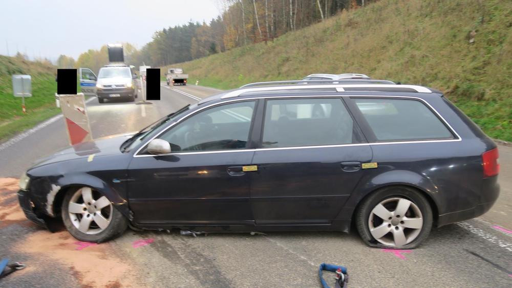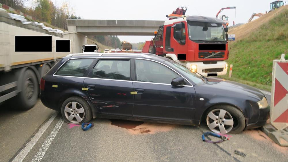 Honička u Jítravy. Ujíždějící auto zastavil až zastavovací pás, silnice byla uzavřená