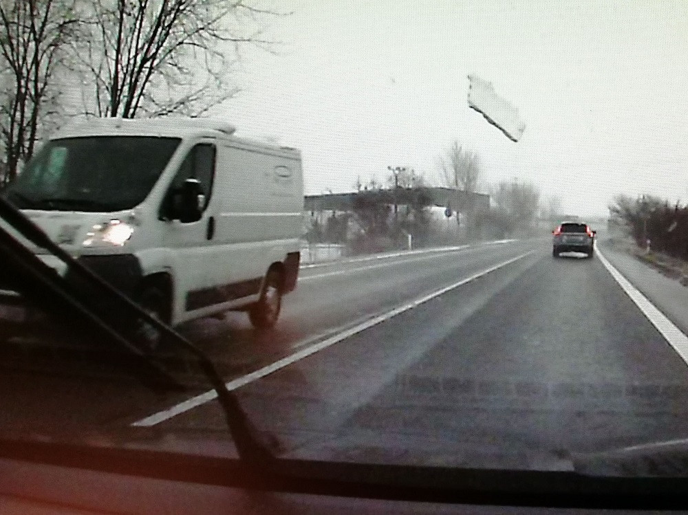 Padající led z kamionu je otázkou dvou sekund. Řidič nemá šanci zareagovat, upozorňuje policie