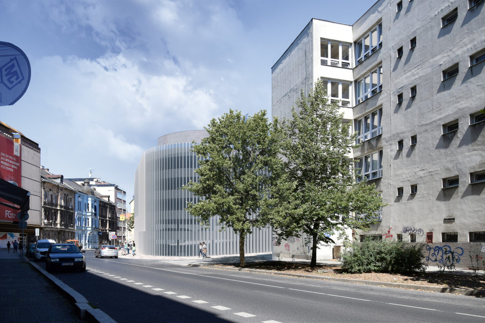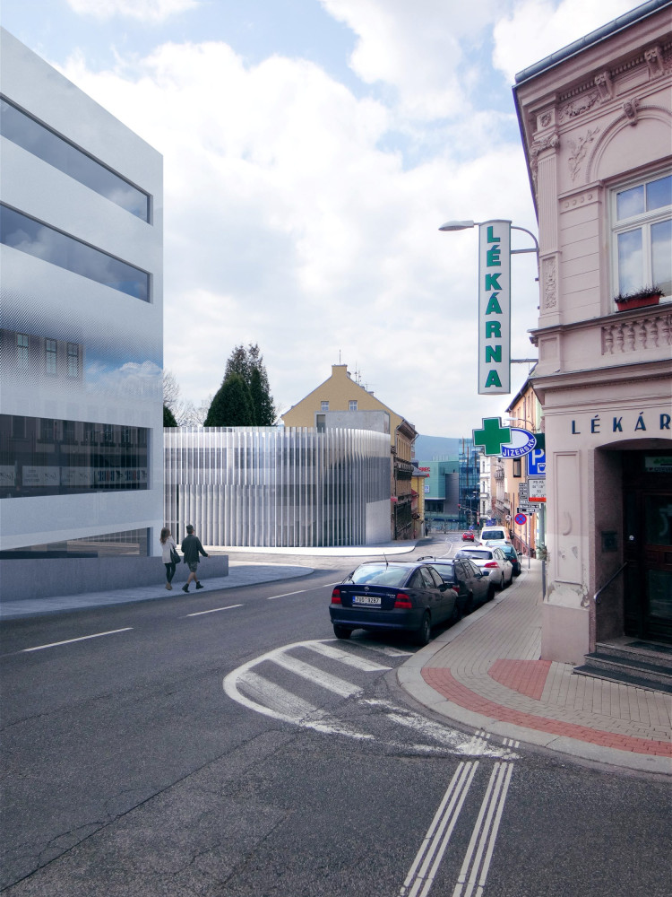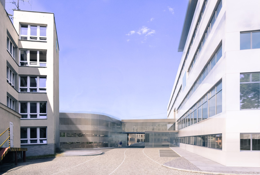 Podoba nového pavilonu nemocnice a parkovacího domu s energocentrem.
