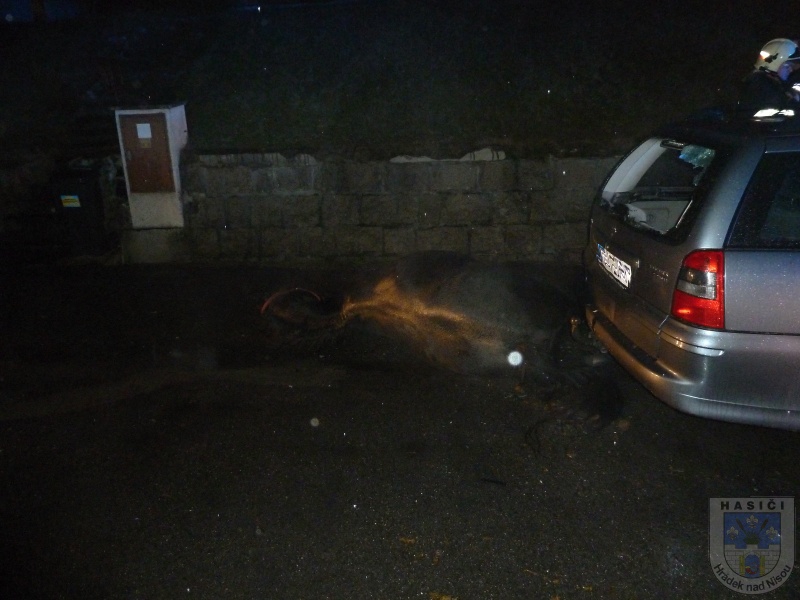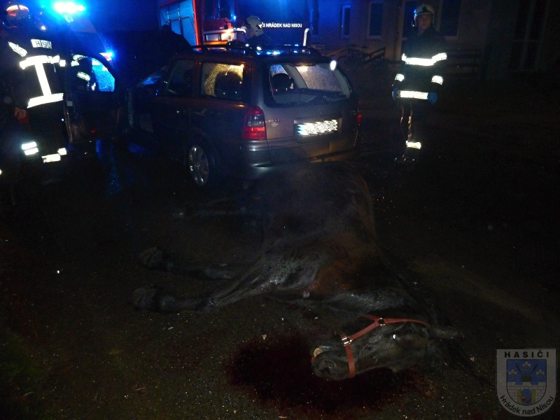 Tvrdý náraz v Oldřichově. Řidička večer usmrtila koně. Foto: Hasiči Hrádek nad Nisou