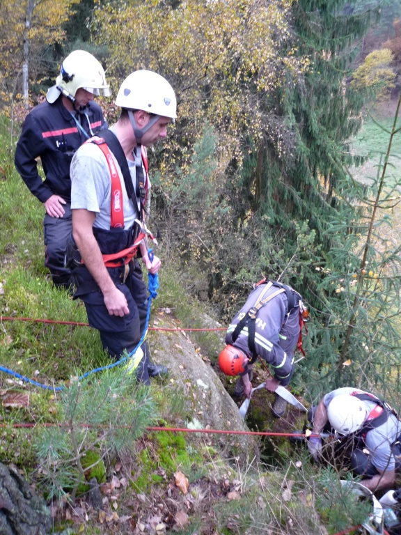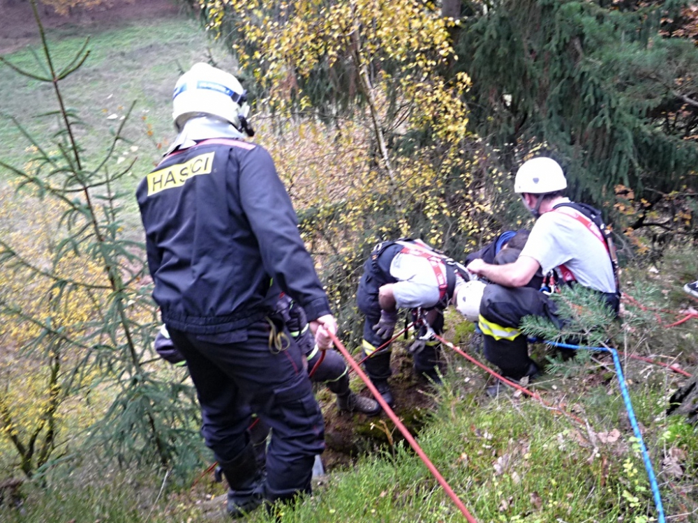 Vlčák zapadl do průrvy. Hasiči ho zachraňovali šest hodin. Foto: HZSLK