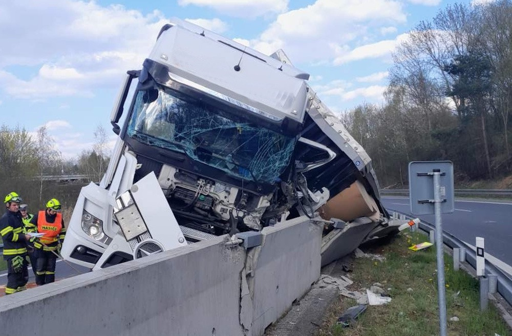 Na nájezdu u Ohrazenic havaroval kamion s papírem. Řidič se zranil