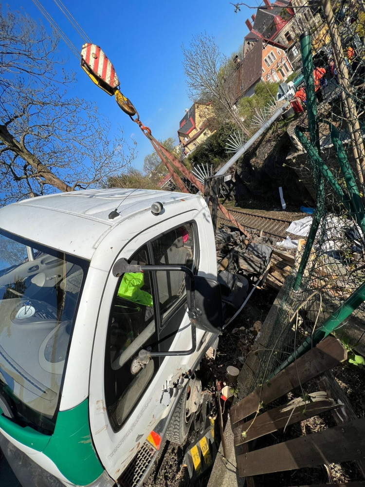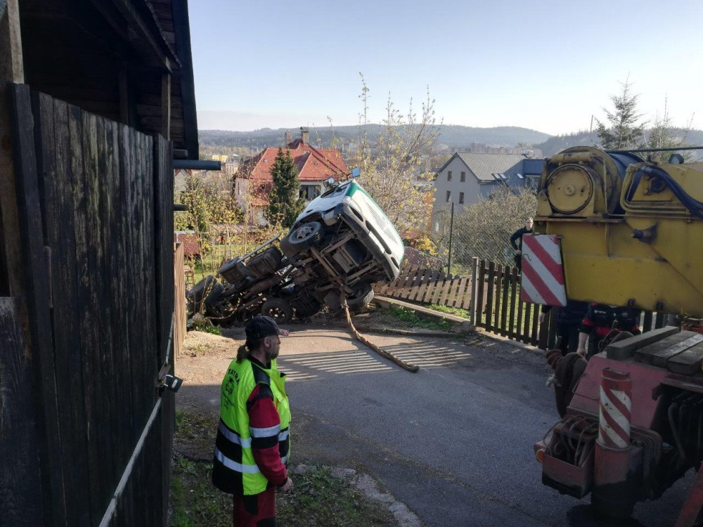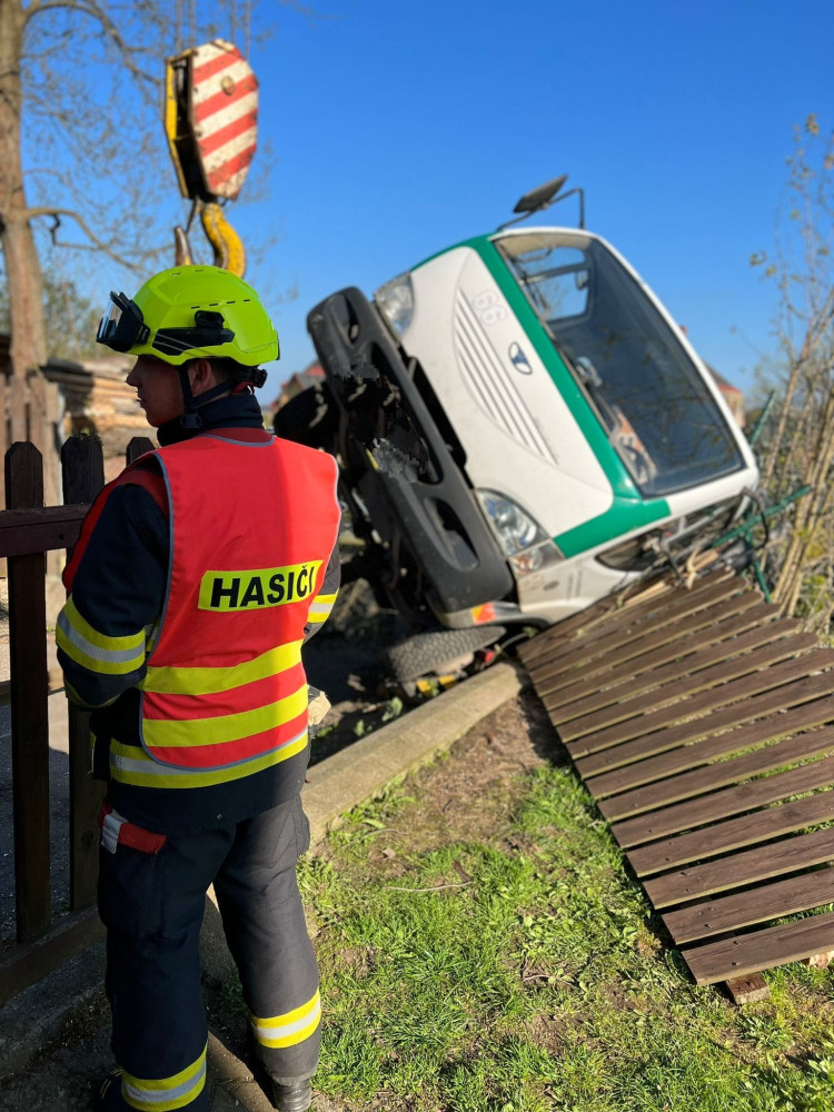 Bagr se zřítil z náklaďáku do kolejiště, vyprostili ho drážní hasiči