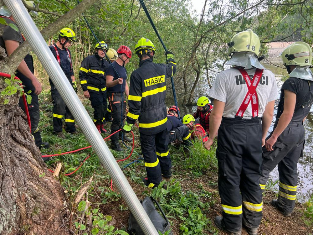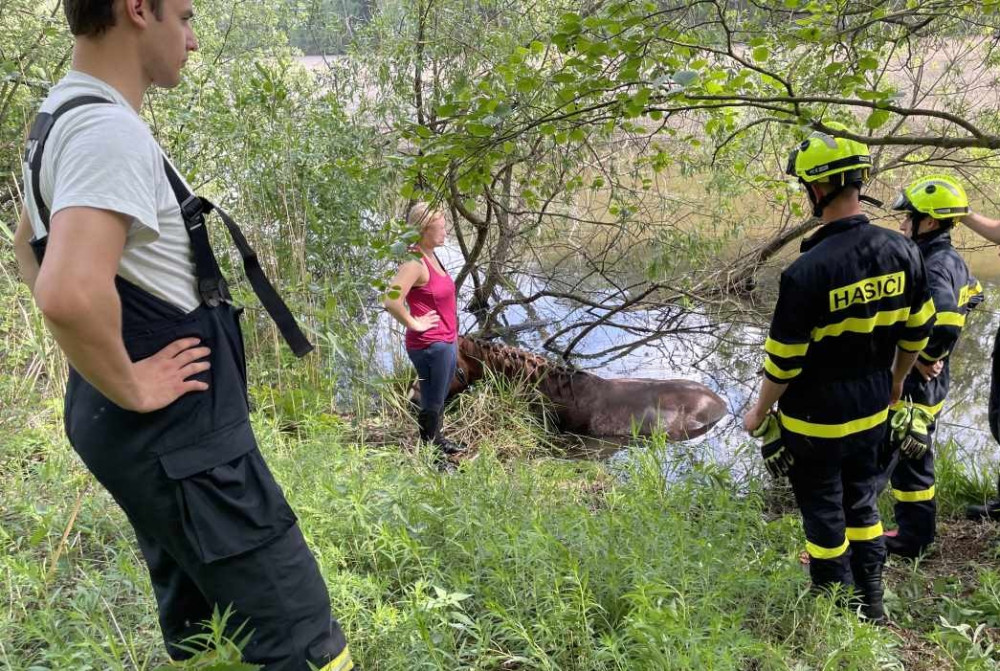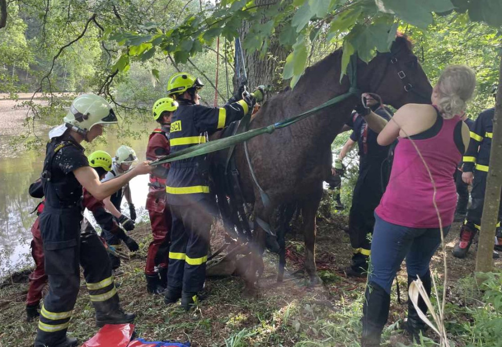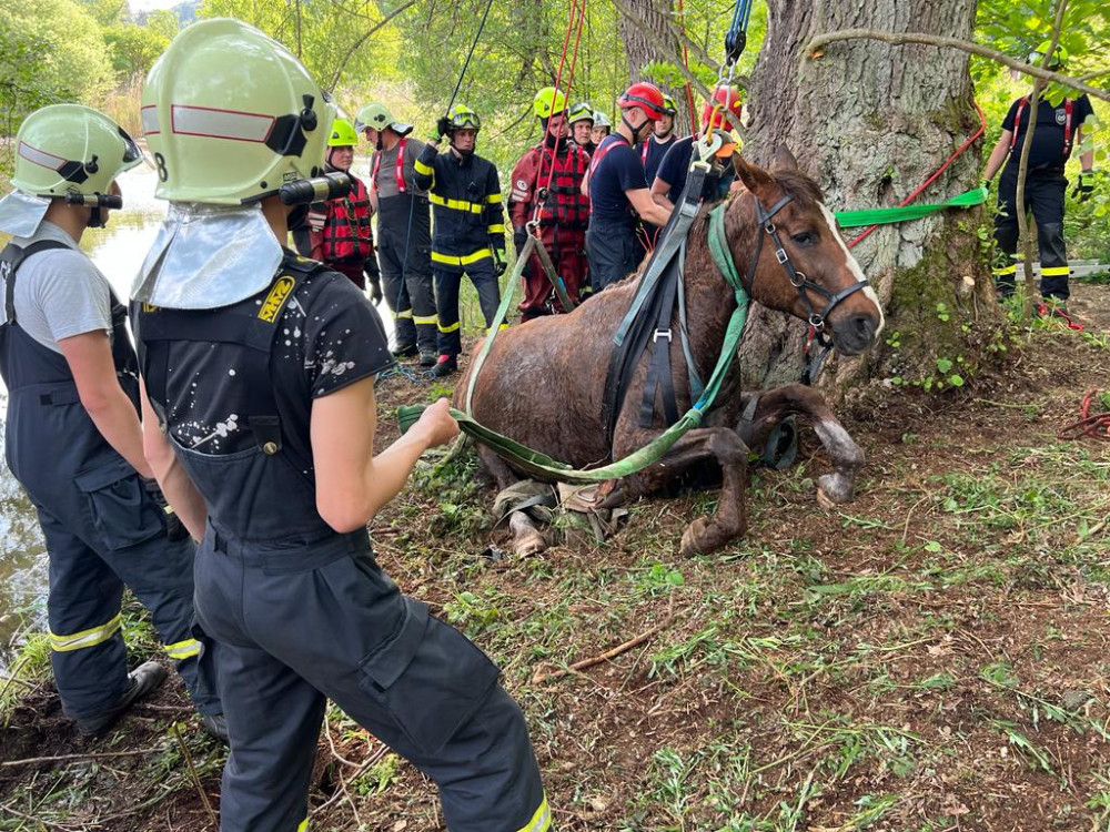 Hasiči zachránili koně, který uvízl v bahně. Použili síť a kladku