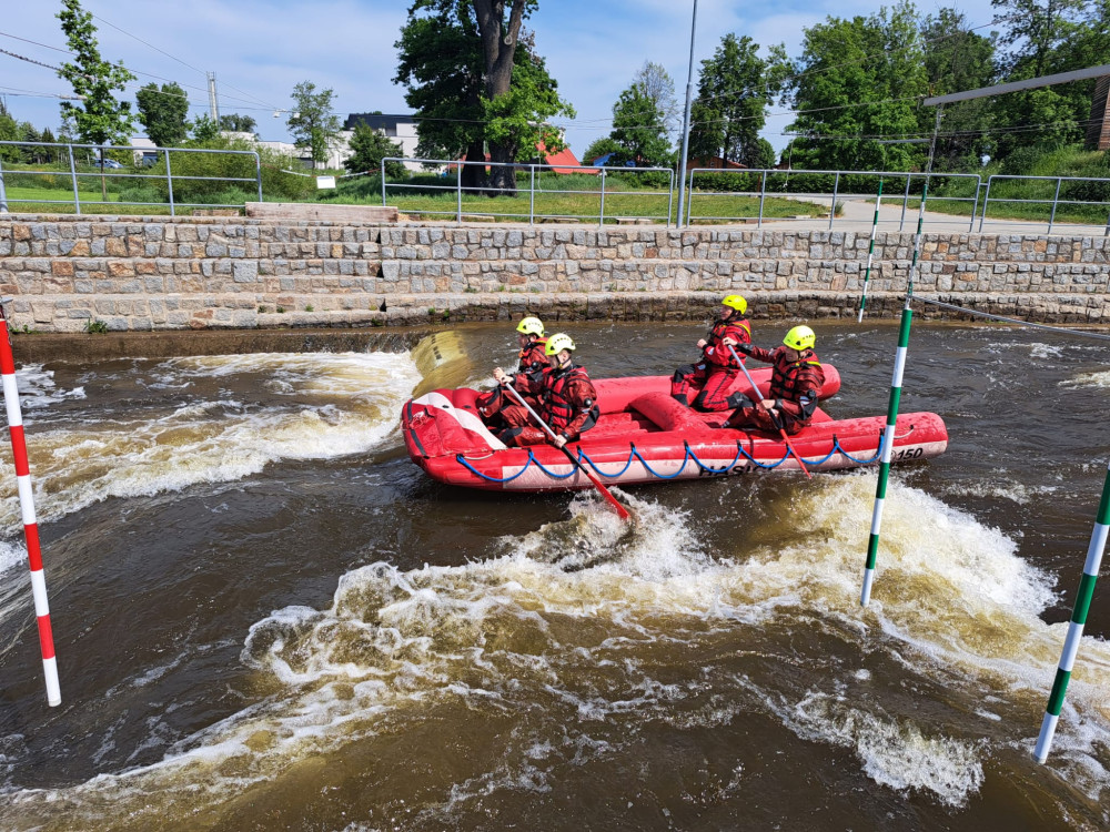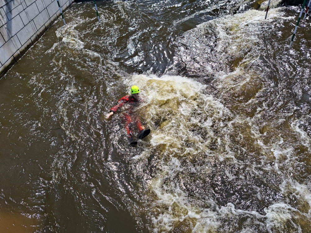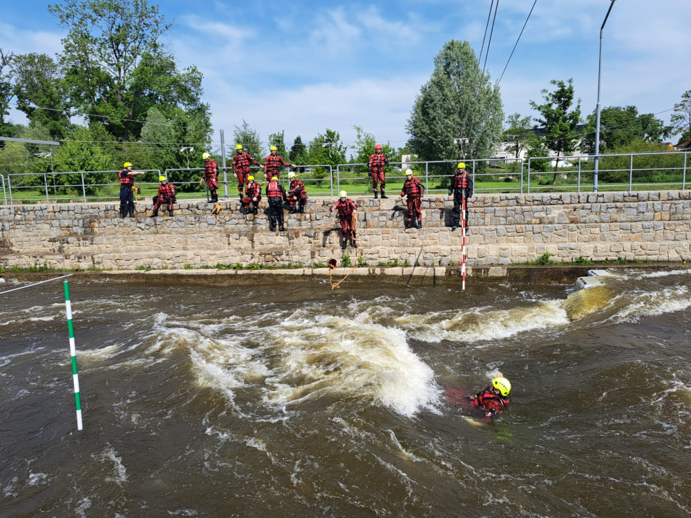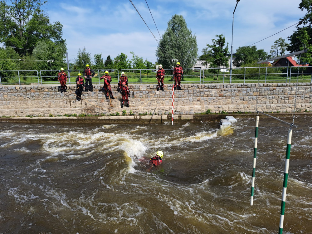 Profesionální hasiči trénovali záchranu tonoucích v kanálu na divoké vodě
