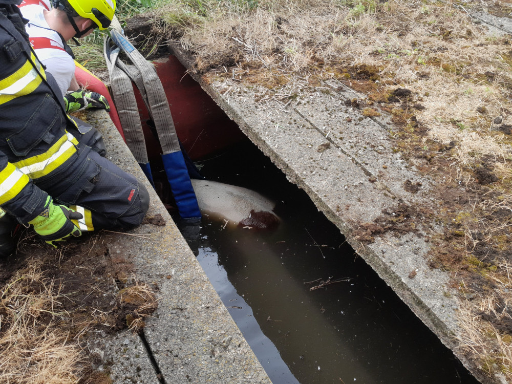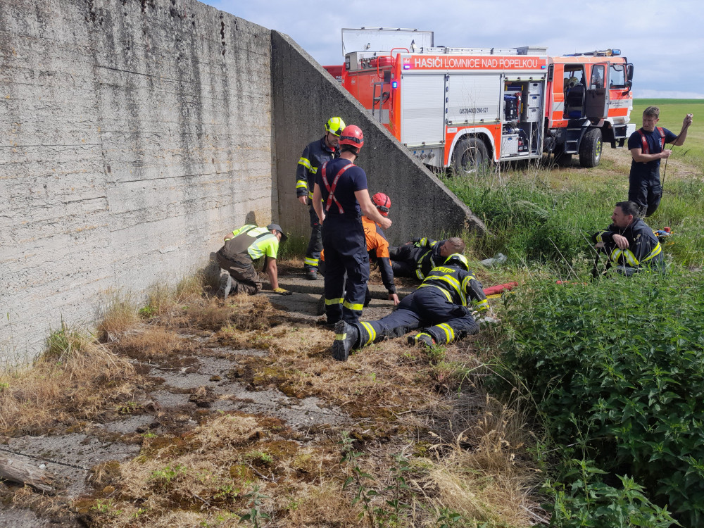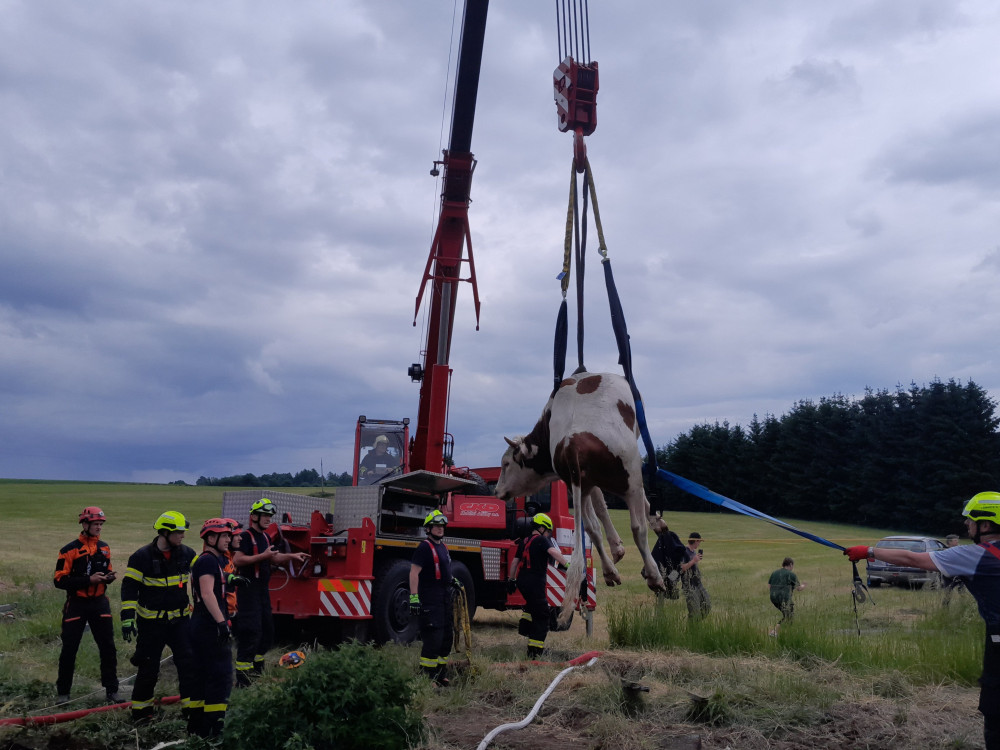 Kráva spadla do septiku, hasiči ji vytáhli ven ve speciální síti