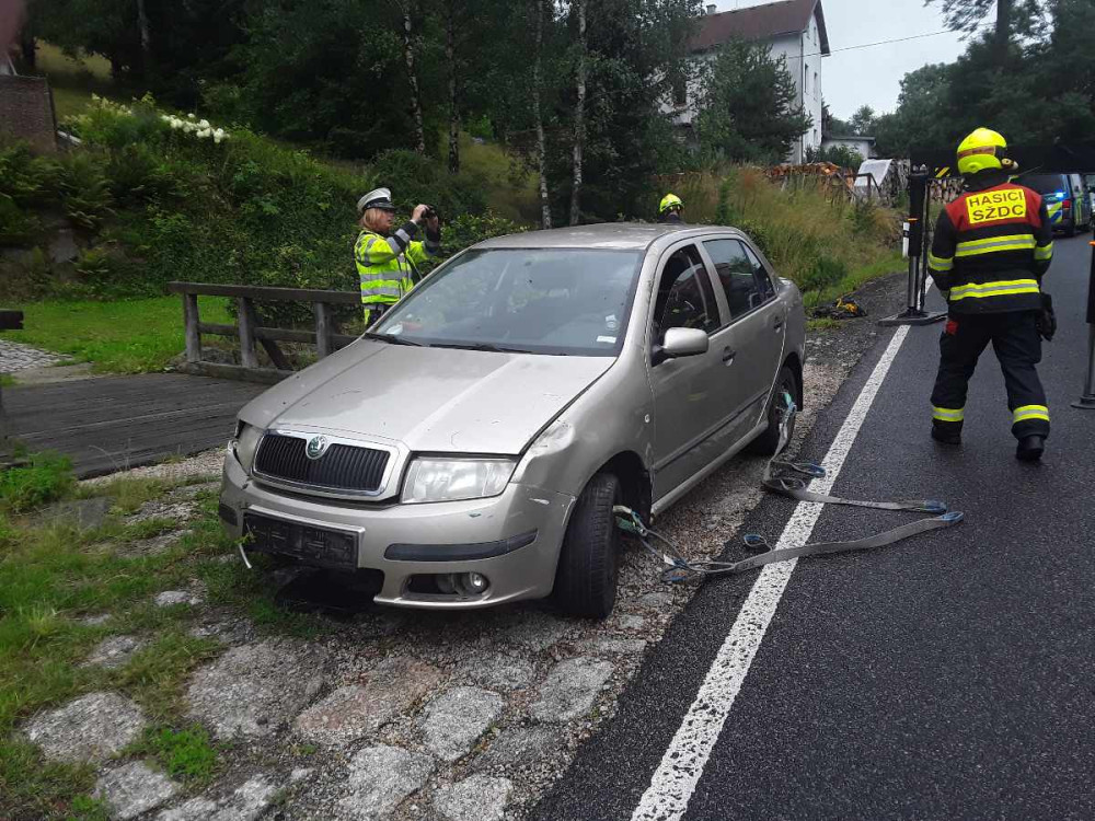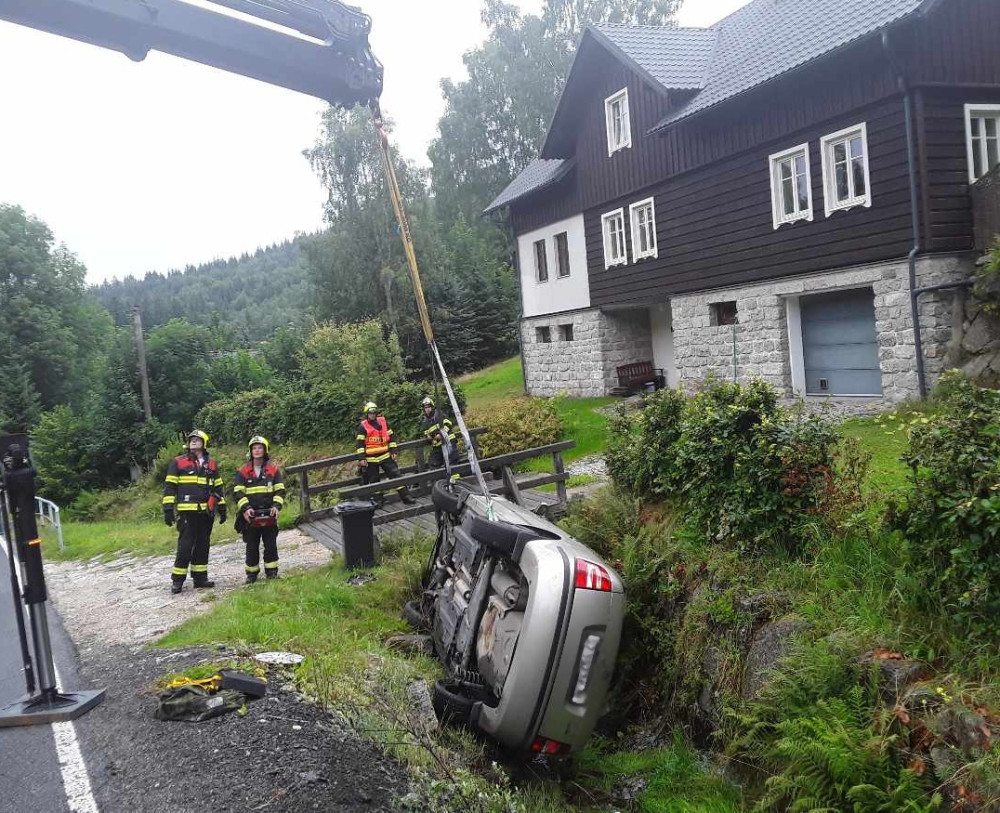 Auto uklouzlo na mokré silnici a zapadlo do potoka. Nikdo se nezranil