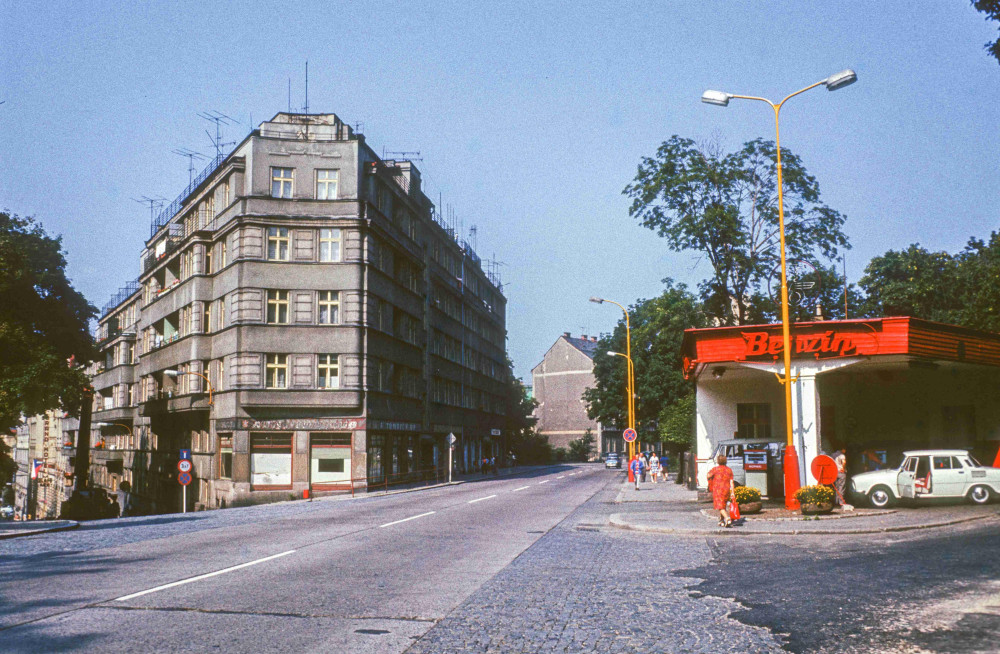 Snímek čerpací stanice pod křídly národního podniku Benzina od fotografa Jana Kabíčka, publikovaný v obrazové knize Liberec, vydané v roce 1977.
