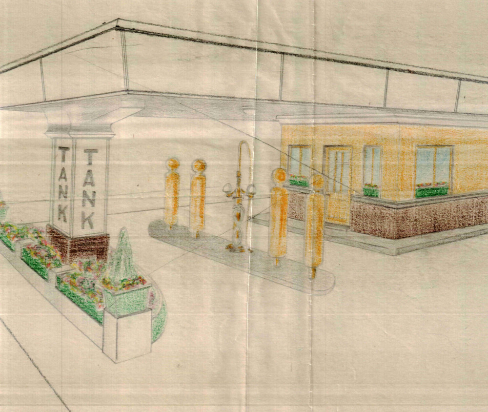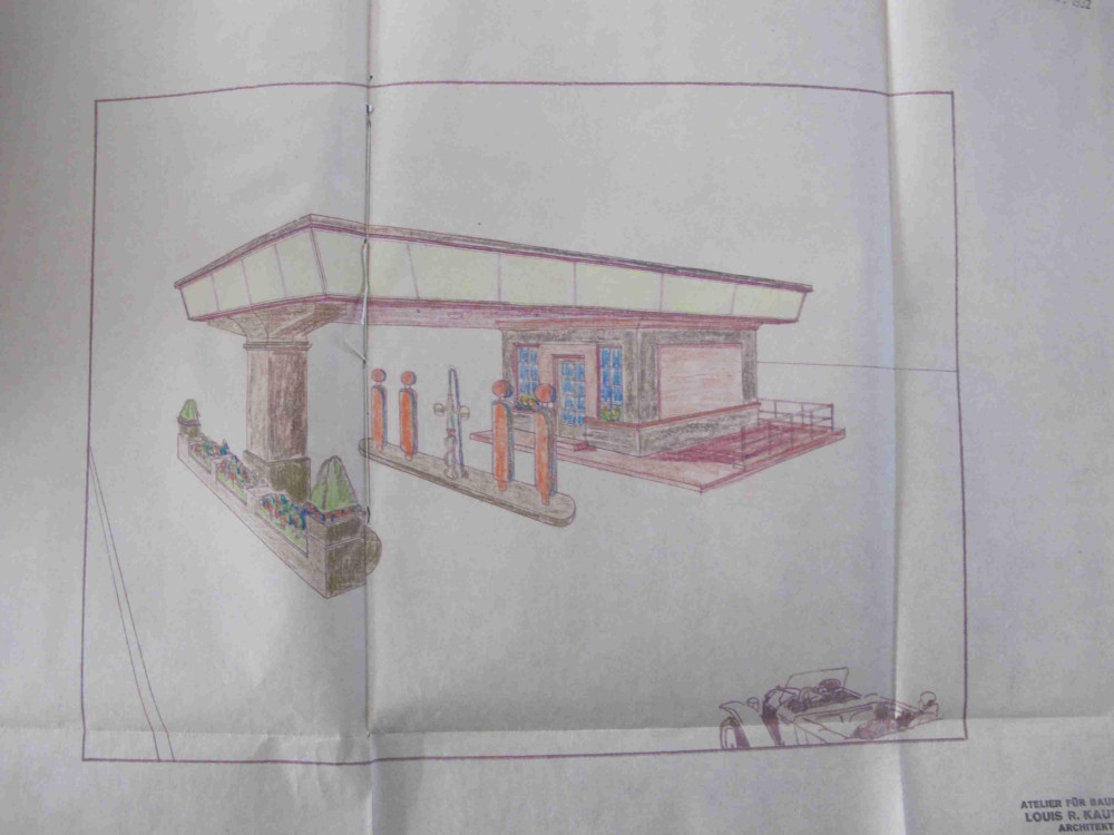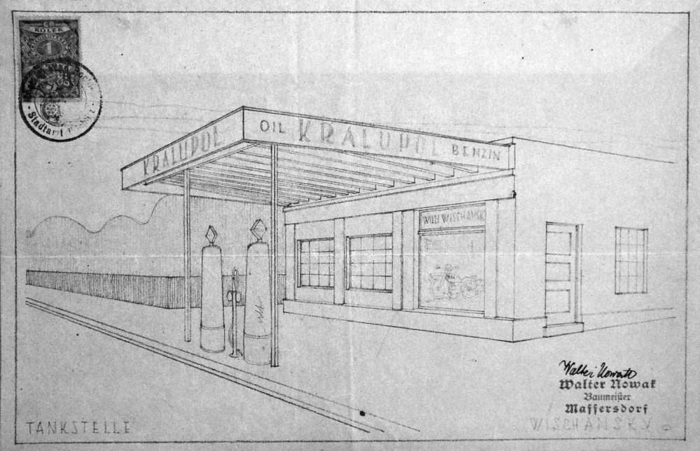 Zaniklá čerpací stanice Kralupol kioskového typu, provozovaná Willy Wischanským v Rochlici. SOkA Liberec